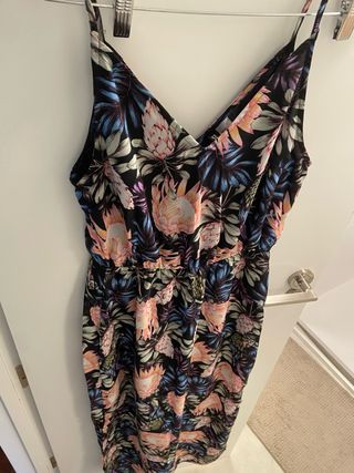 Vestido con un llamativo estampado floral sobre fondo negro. Su diseño es fresco y veraniego. - Tirantes finos. - Cintura elástica. - Largo midi.