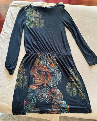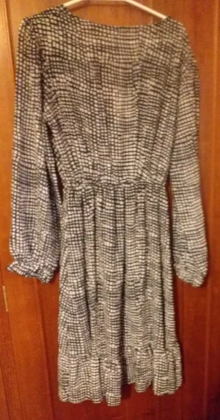 Vestido con etiqueta, ideal para cualquier ocasión. Diseño estampado; manga larga;con volante en puño y bajo. Forro interior. Medidas aprox: ancho hombro 40 cm, longitud 94 cm.