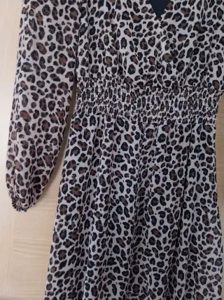 Vestido largo con estampado de leopardo. Tiene manga larga y cintura elástica. - Diseño cruzado en la parte superior. - Tejido ligero y fluido.