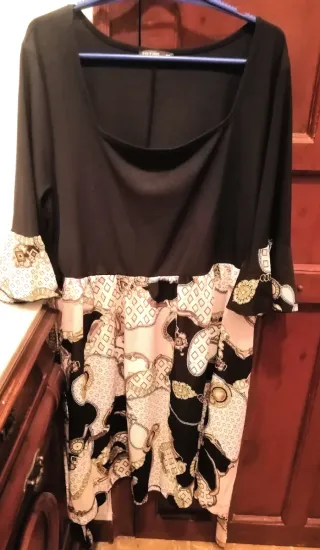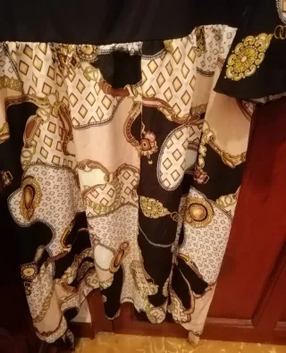 Precioso vestido con un diseño elegante y llamativo. - Cuerpo superior en color negro. - Falda con estampado de motivos geométricos en tonos beige, negro y dorado. - Mangas negras, acampanadas al final con el mismo estampado que la falda, se puede atar en la espalda. - Corte que favorece la figura.