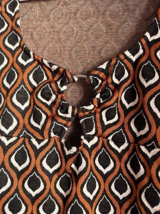 Vestido de manga larga con un llamativo estampado geométrico. - Diseño con escote pronunciado y detalle de lazada. - Estampado en tonos marrones, negros y blancos.