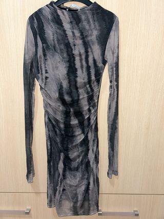 Vestido de manga larga con un llamativo estampado tie-dye en tonos grises y negros. El diseño presenta un favorecedor fruncido a lo largo de un lateral que añade textura y forma. - Manga larga. - Estampado tie-dye. - Detalle de fruncido lateral.