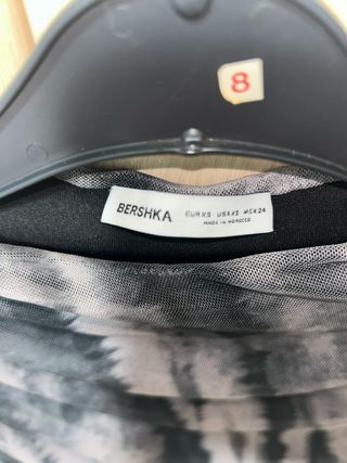 Vestido de Bershka con un diseño llamativo. - Cuerpo superior negro con detalles de malla. - Panel central con estampado de leopardo en blanco, negro y rosa. - Falda negra de corte suelto.