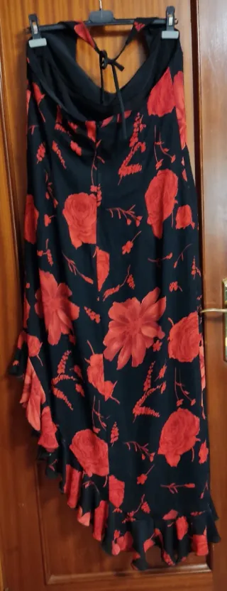 Vestido largo con un llamativo estampado floral en tonos rojos sobre fondo negro. Su diseño asimétrico y los volantes le dan un toque muy especial, atado si cuello, cremallera en la espalda.Tejido crepe. Forrado,confeccionado por modista. Era para boda que no se llevó a cabo. Sisas: 50 cm. Cadera: 56 cm. Cintura: 49 cm Largo, parte corta: 95 cm. Largo , parte larga: 141 cm - Escote halter con tiras para atar. - Bajo asimétrico con volante. - Estampado de rosas y flores rojas.