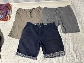 Vendo lote de 3 pantalones cortos (tipo shorts) de vestir para hombre. Talla 40 (S - small). Colores: Aulario Marino, Gris y Marrón beige. Marcas: Lefties, TEX y Ridge & Co. Chollo, oferta. Precio: 6€. Hago envíos rápidos. - Un pantalón de vestir beige. - Un pantalón corto azul con estampado. - Un pantalón corto gris con estampado.