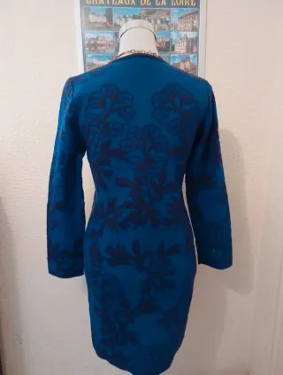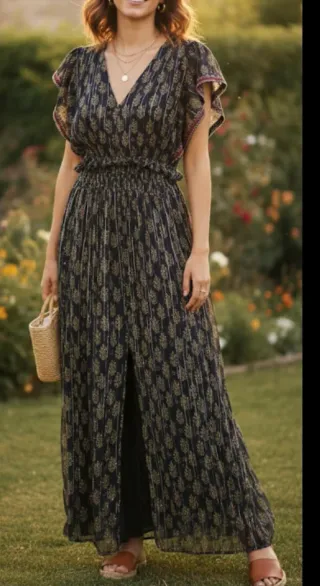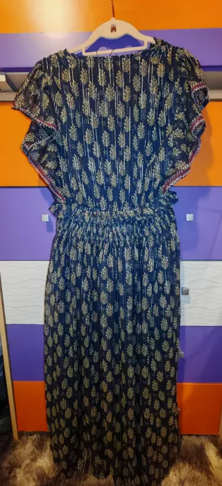 vestido largo de estilo bohemio en color azul marino con un elegante estampado de hojas en tonos dorados. Es una prenda con mucho movimiento y detalles muy cuidados, ideal tanto para eventos de día como para una noche especial. Características principales: Tejido: Gasa ligera con rayas verticales de hilo metalizado (lúrex) que le aportan un brillo sutil y muy elegante cuando le da la luz. Detalles: Las mangas de tipo mariposa tienen un bordado artesanal precioso en tonos granates, rosas y blancos (ver fotos de detalle). Corte: Escote en "V" y cintura elástica tipo nido de abeja que realza la figura y se adapta perfectamente a di