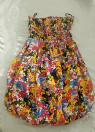 Vestido de verano con un alegre estampado floral. Su diseño sin tirantes y la falda abullonada lo hacen ideal para días/noches cálidos. - Estampado floral vibrante. - Diseño sin tirantes. - Falda con volumen.