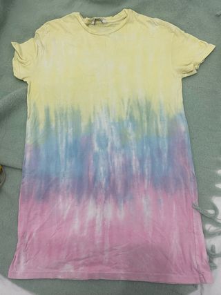 Vestido ancho con un diseño tie-dye degradado. - Mangas cortas. - Cuello redondo. - Estampado tie-dye con tonos amarillos, azules y rosas.