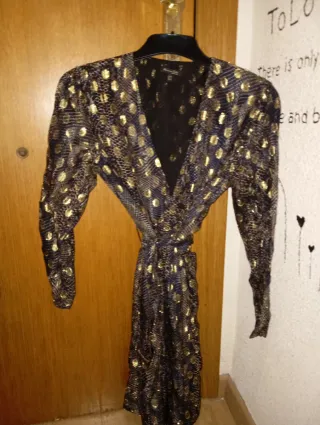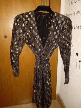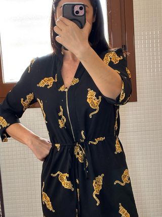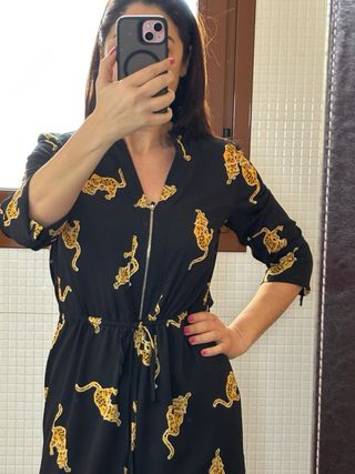 Vestido con un llamativo estampado de leopardo. - Diseño en color negro con detalles dorados. - Cremallera frontal. - Cintura ajustable con cordón. -vestido talla S pero da para una talla 38/40