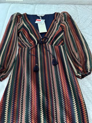 Vestido de Springfield con estampado de rayas verticales en tonos tierra, verde y negro. Presenta un escote en V con cordones y detalles de borlas, mangas largas abullonadas y un corte que estiliza la figura. - Cierre de cordones en el escote. - Mangas largas abullonadas con puños elásticos. - Detalle de borlas en los cordones del escote. - Tejido de punto con textura.