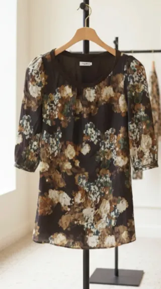 Vestido de la marca Fórmula Joven Tiene un diseño muy favorecedor con un estampado floral en tonos tierra, ocres y toques de verde sobre un fondo marrón chocolate. Detalles del producto Marca: Fórmula joven. Estado: En muy buen estado Talla: 40. Manga: Manga francesa (al codo) con un ligero detalle abullonado en el hombro que le da un toque elegante. Escote: Redondo con un acabado ribeteado en color marrón liso. Tejido: Tacto suave, tipo satén ligero con un acabado sutilmente brillante que lo hace apto tanto para el día a día como para ocasiones más formales.