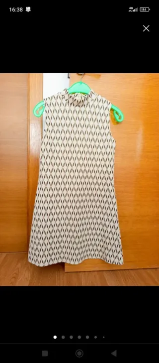 Precioso vestido de la marca Sfera. - Diseño sin mangas. - Cuello alto. - Estampado geométrico en beige y negro. Precioso vestido de la marca Sfera, talla S. Es de color beige y marrón. - Diseño elegante y moderno. - Perfecto para cualquier ocasión.