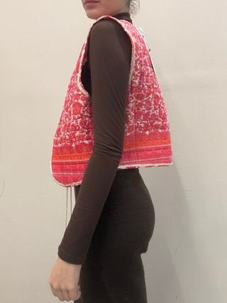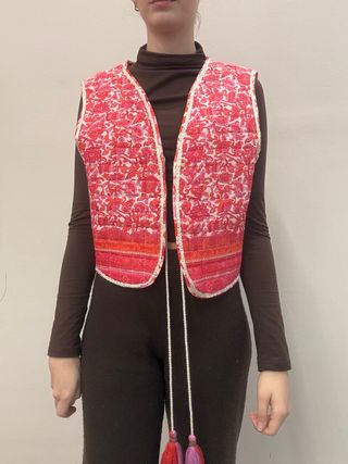 Este chaleco corto presenta un vibrante estampado floral en tonos rosas y rojos. Su diseño es ligero y versátil. - Estampado floral detallado. - Ribete decorativo en contraste. - Cierre con cordón y borlas.
