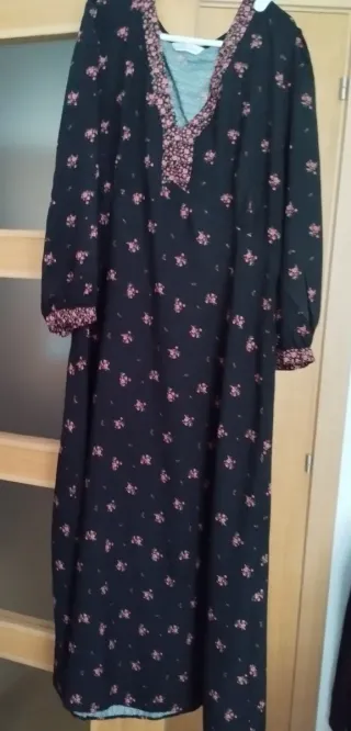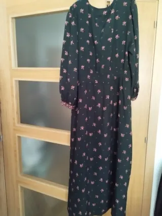 Vestido largo con estampado floral en tonos morados y negros. Presenta un diseño con cuello alto y mangas largas. Muy bonito y nuevo