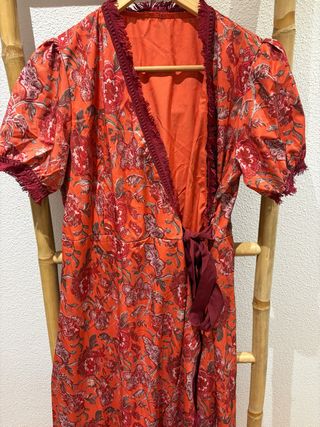 Vestido de punto con un alegre estampado floral. Es cómodo y versátil. - Diseño de manga corta. - Bolsillos frontales. - Cuello redondo con detalleVestido punto, tipo bata o vestido playero, para casa... Talla XL Revisar medidas 92 cm largo 48 cm sisa, 39 cm hombro. Nuevo sin etiquetas.