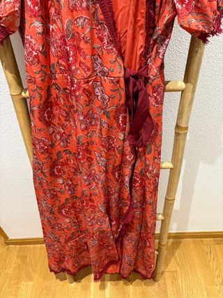 Vestido midi de Springfield con un estampado floral en tonos grises, granates y rosas. Ideal para cualquier ocasión. - Manga larga - Escote en pico con botones - Cintura elástica con cordón - Bajo con volantes - Tela un poco transparente con forro en el cuerpo (no en mangas)