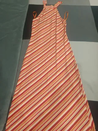 Vestido de verano con un diseño de rayas vibrantes. Ideal para días soleados. - Estampado de rayas diagonales. - Tirantes finos. - Corte largo.