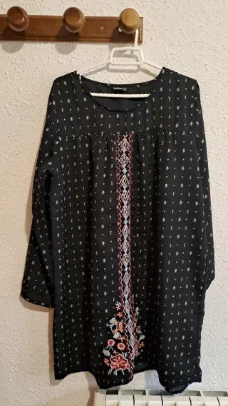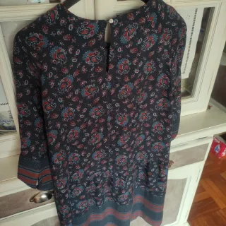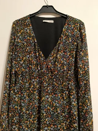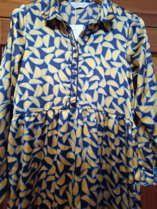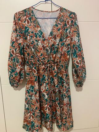 Vestido ligero con un bonito estampado. - Escote en V. - Cintura elástica con cordón. - Mangas largas abullonadas. llevo talla s y me está amplio
