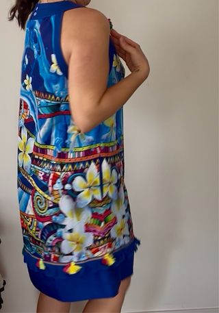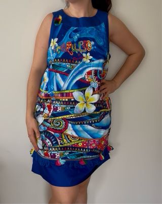 Vestido de corte recto con un vibrante estampado inspirado en Acapulco y flores tropicales. - Bolsillos laterales - Diseño sin mangas. - Detalle de flecos y pompones en el bajo. - Escote redondo.