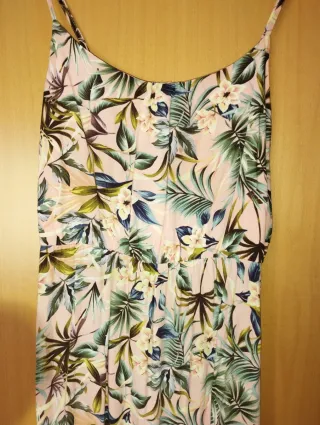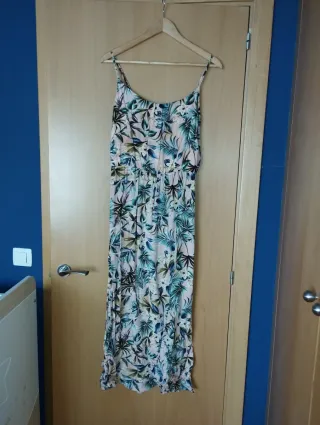 Vestido largo con un bonito estampado en tonos verdes y multicolor. La parte superior es fruncida y elástica, y la falda tiene varios volantes. La talla no la especifica pero es más o menos una M. - Tejido ligero y fluido. - Diseño con múltiples capas en la falda. - Detalle de cinta negra en la cintura. - Por la parte de delante es corto y por detrás largo Está un poco despelujado como se indica en la foto un poco en el borde
