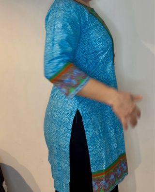 Vestido de estilo indio con un diseño vibrante y colorido. Perfecto para añadir un toque exótico a tu guardarropa. - Estampado intrincado en tonos azules y multicolor. - Cuello redondo con detalle bordado. - Mangas 3/4. - Borde inferior y de las mangas con diseño paisley. - Aberturas laterales.