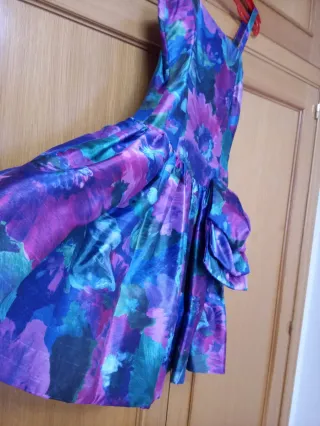 Conjunto de vestido y bolero, ideal para ocasiones especiales - Vestido con tirantes, de corte evasé en un estampado floral vibrante. - Bolero corto a juego - Tejido satinado con brillo, suave y fluído. - Precio no negociable