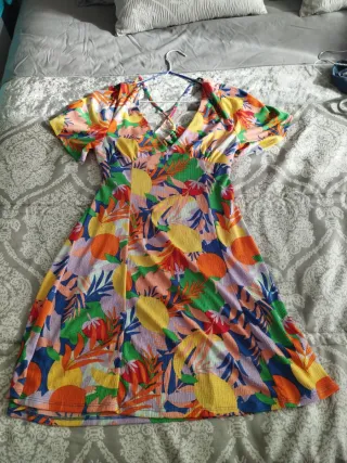Vestido midi con un vibrante estampado de frutas y hojas tropicales. Ideal para un look fresco y veraniego. - Diseño cruzado en el escote. - Mangas cortas y con vuelo - Cintura elástica para un mejor ajuste. - Falda con vuelo.