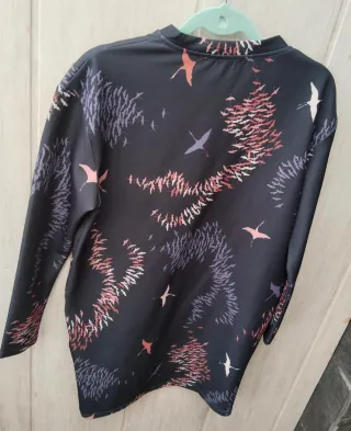 Precioso vestido con un diseño llamativo y elegante. - Estampado de pájaros y flores sobre fondo negro. - Detalle de mangas 3/4 con abertura abajo - Corte favorecedor.