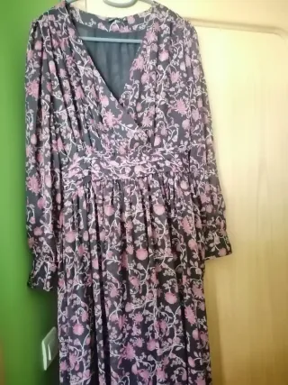 Vestido largo con un bonito estampado floral. Presenta un diseño cruzado en la parte delantera y mangas largas. - Estampado floral en tonos verdes y rosas sobre fondo negro. - Mangas largas abullonadas. - Largo hasta los tobillos. - Con forro -En etiqueta pone talla 40 pero es una 38 por la cintura estrecha que tiene.. -Medidas: Hombros:38. Axila:46 Cintura:34. Largo:141