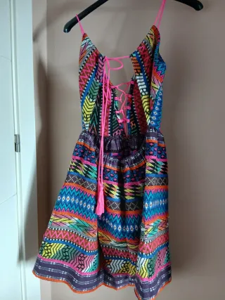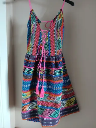 Vestido con un vibrante estampado étnico y detalles de cordones. - Diseño con tirantes finos. - Escote pronunciado con lazada. - Adornado con borlas. - Largo hasta la rodilla.