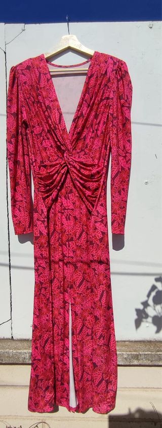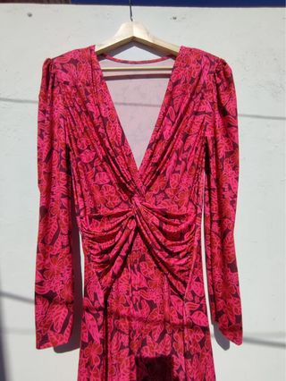 Vestido largo con un vibrante estampado floral en tonos rosas y rojos. Presenta un escote pronunciado y un drapeado frontal que estiliza la figura. - Manga larga abullonada. - Diseño cruzado con nudo. - Tejido elástico y fluido. está sin estrenar pero no tiene etiqueta