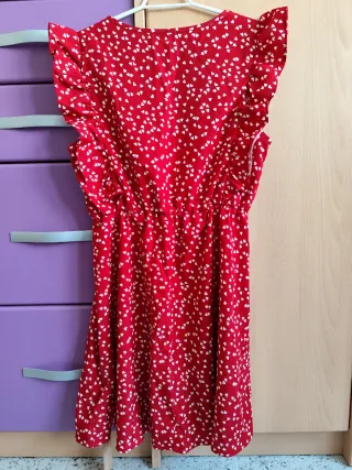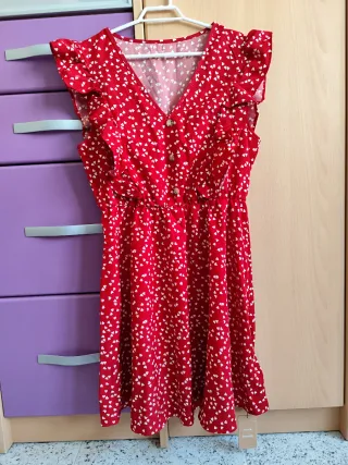 Vestido de Shein, color rojo, estampado corazones blancos, escote en V Manga con volantes Botones en la parte delantera Talla M Nuevo con etiqueta