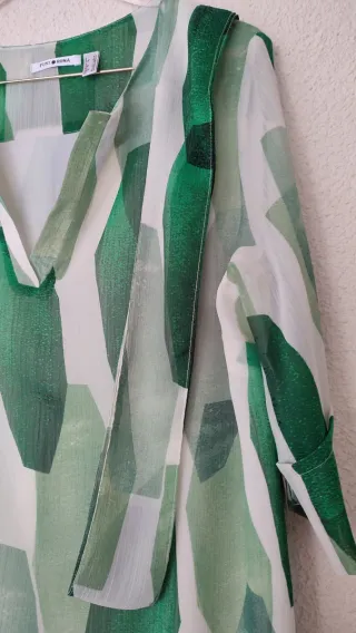 Vestido midi Estampado en colores blancos y tonos verdes. Con escote en pico y cinturón a juego. Manga 3/4 Marca: Punto Roma Composición: 100% poliéster Talla: 42. Medidas en las fotos, tanto de sisa a sisa como de largo. Estado: como nuevo. Precio: 24€