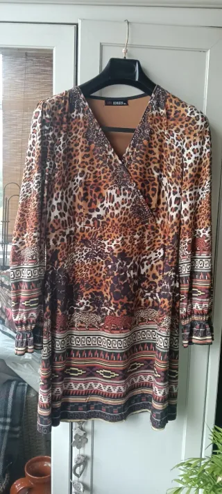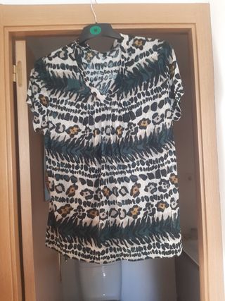 Camiseta de vestir con un llamativo estampado. Está sin estrenar y tiene una caída preciosa. Muy suave y adaptable. Debe ser muy cómoda. - Diseño con cuello en V. - Mangas cortas. - Estampado animal print y tribal.
