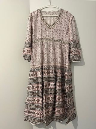 Vestido midi con estampado floral y detalles étnicos. Presenta manga de tres cuartos y un corte fluido. - Escote en pico. - Estampado multicolor con predominio del rosa. - Largo midi. - Manga 3/4 con goma.
