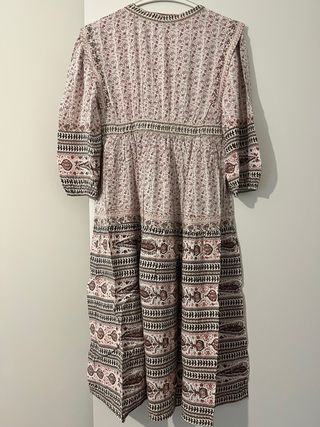 Vestido largo de Oysho con estampado bohemio. Tiene manga larga abullonada y cuello redondo con abertura. - Cierre de botones en la parte delantera. - Tela suave al tacto. - Talla XS. Está muy bien cuidado, como nuevo. Lo he usado dos veces contadas. 📍 Entrega en mano en Collado Villalba o envío.