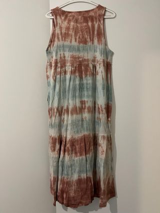 Vestido largo sin mangas con estampado tie dye. - Diseño con botones frontales. - Varios niveles con vuelo. - Estampado en tonos marrones y verde azulado. - Da bastante talla.