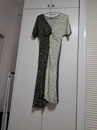 Vestido de la marca Bimba y Lola con un diseño original. - Estampado de puntos en contraste. - Corte cruzado en la parte delantera. - Detalle de nudo en la cintura. - Manga corta. - Largo midi.