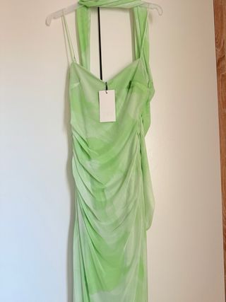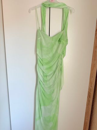 Elegante vestido largo con un diseño fluido y drapeado. - Estampado abstracto en tonos verdes y blancos. - Tirantes finos. - Detalle drapeado en el lateral.