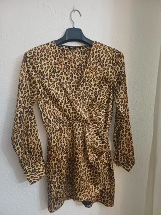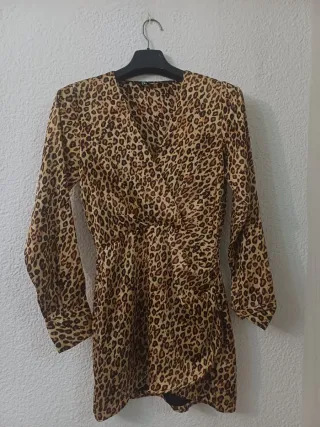 Vestido de Zara con un llamativo estampado de leopardo. Su diseño cruzado y drapeado en la cintura crean una silueta favorecedora. Talla S. - Manga larga. - Escote en V. - Largo mini.