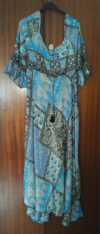 Vestido largo con un bonito estampado paisley en tonos marrones y multicolor. Tiene un corte favorecedor y es talla única. - Escote en V. - Mangas cortas con volantes. - Cintura elástica. - Bajo con volante.