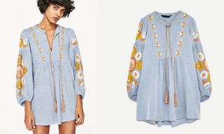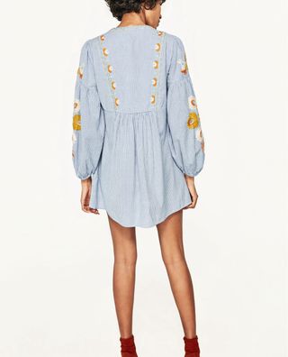 Mini Vestido o blusón de Zara con un bonito estampado de rayas y detalles bordados. - Diseño con escote en V y cordones. - Mangas largas abullonadas. - Bordados florales en mangas y pecho. - Tassels decorativos en los cordones.