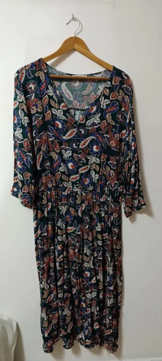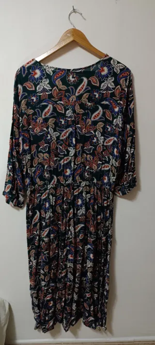 Vestido largo con un llamativo estampado. - Diseño con cuello en V. - Fruncido en la cintura. - Mangas largas abullonadas. - Talla M pero da para 38/40
