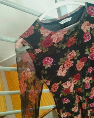 Vestido con un bonito estampado de flores en tonos rojos y rosas sobre fondo negro. Ideal para un look llamativo. - Diseño de manga larga. - Tejido ligero y semitransparente.