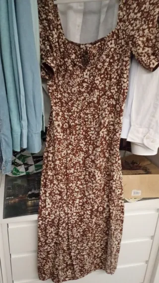 Vestido de gasa con estampado floral marron beige y dorado con brillantitos sobre fondo marrón oscuro. Talle fruncido. Es una XS no demasiado ajustado, sirve como una S. Usado solo una vez para ocasión especial. Su precio nuevo es 69,99 € se puede encontrar parecido en el corte inglés y en sarenza. - Diseño con cuello redondo y manga larga. - Cuerpo fruncido con detalle de volantes. - Falda con vuelo.
