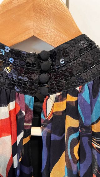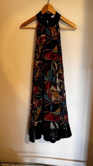 Vestido de Zara con un estampado vibrante y detalles brillantes. - Diseño halter. - Cuello adornado con lentejuelas. - Bajo con banda de lentejuelas. - Posibilidad de llevarlo suelto con vuelo o a la cintura con un cinturón fruncido de color turquesa