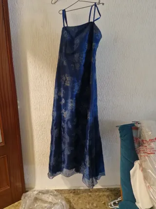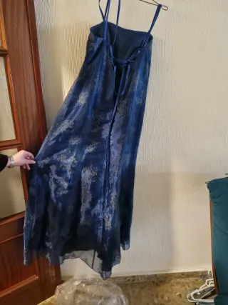 Vestido de fiesta azul con estampado plateado