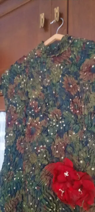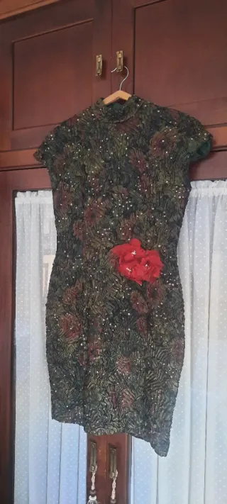 Vestido de manga larga con un llamativo estampado. puesta una vez en una boda.