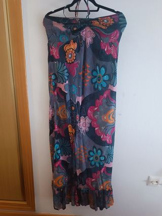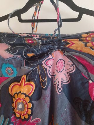 Vestido de la marca Redondo con un estampado llamativo. ideal para eventos - Diseño con cuello alto. - Manga corta. - Tejido satinado. -atado atrás al cuello con parte de la espalda al aire -el nudo puede apretarse tanto como quieras Usado en una boda, tiene algún hilo suelto que se ve en la 5 y 6 foto , que con paciencia se puede quitar