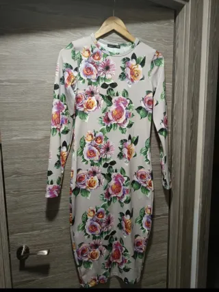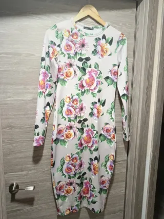 Vestido de manga larga con un estampado floral vibrante. El diseño presenta una base clara en gris con flores en tonos rosas y naranjas. - Diseño de manga larga. - Estampado floral detallado. - Corte ajustado. Solo se ha usado una vez, está en perfectas condiciones 😊